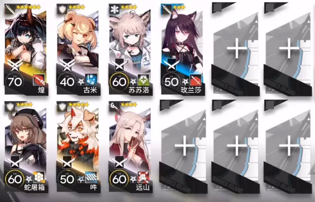 剩下还有五个空位,可以选择近卫/地刺等地面输出(高台位不足)或者特种工具人增加容错率,如果有练更多的重装也可以带上。