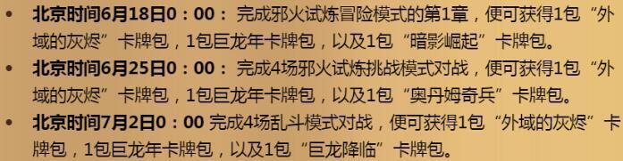 从6月18日起,每周都将有传说级任务,一共将有9个卡包。