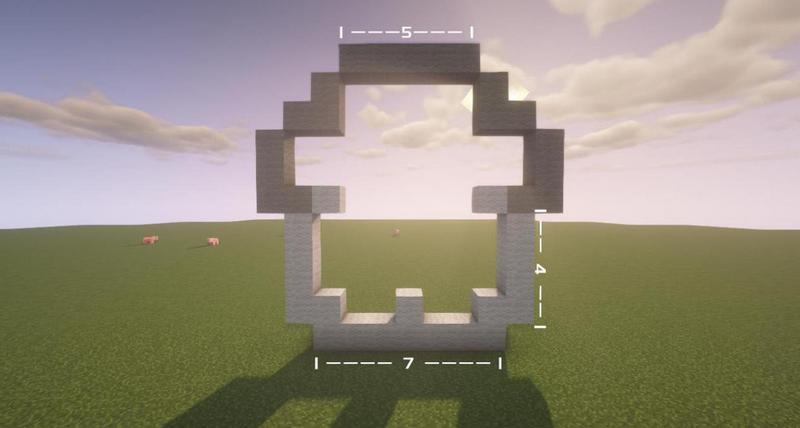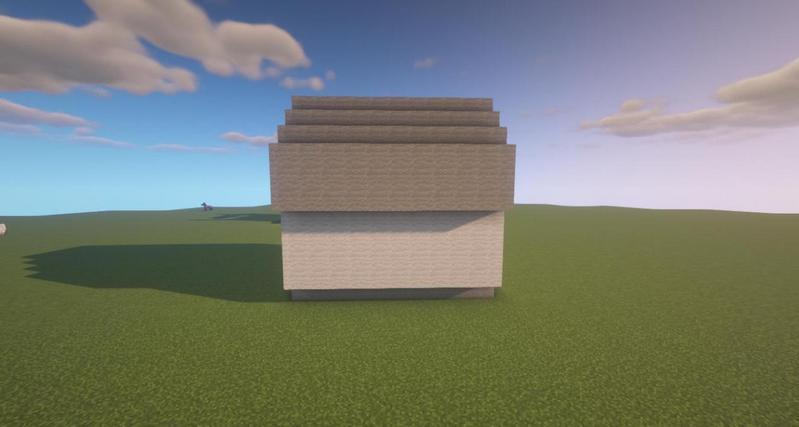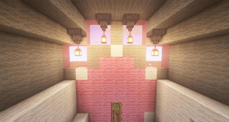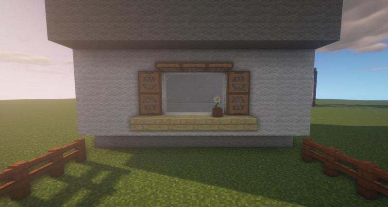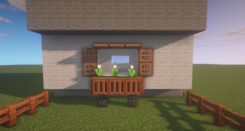 另一边的窗户用同样的方法制作,可以用草方块、金合欢木活板门和圆石墙做一个大花盆。