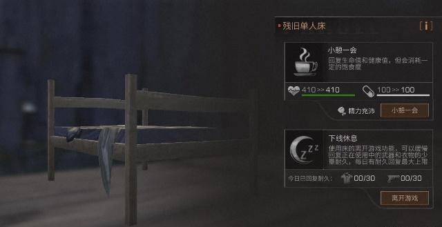相信陪伴大家时间最长的新手床就是这个残旧单人床,能恢复30点衣服和武器的耐久。