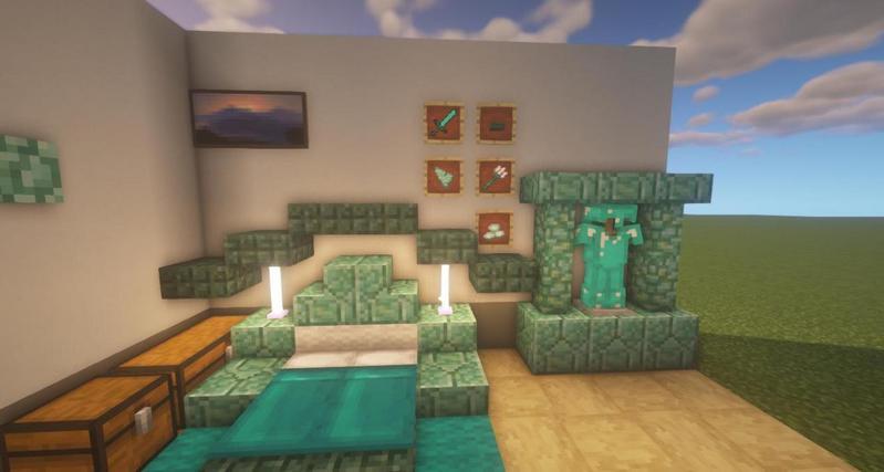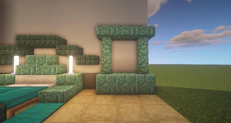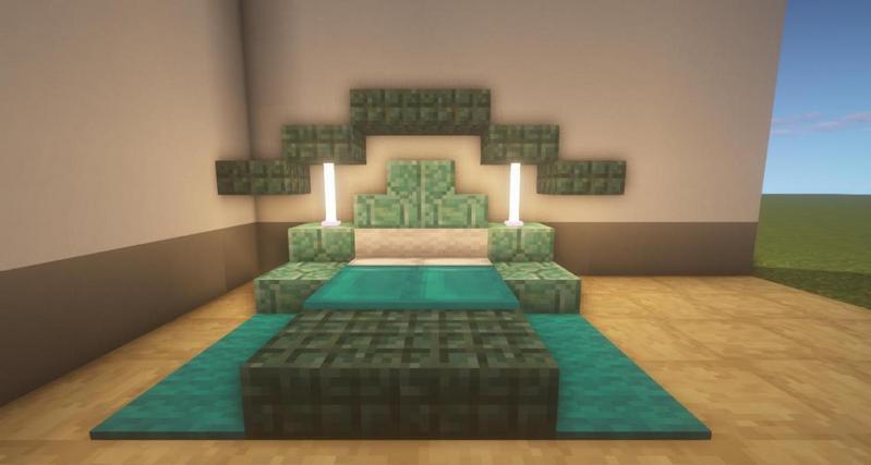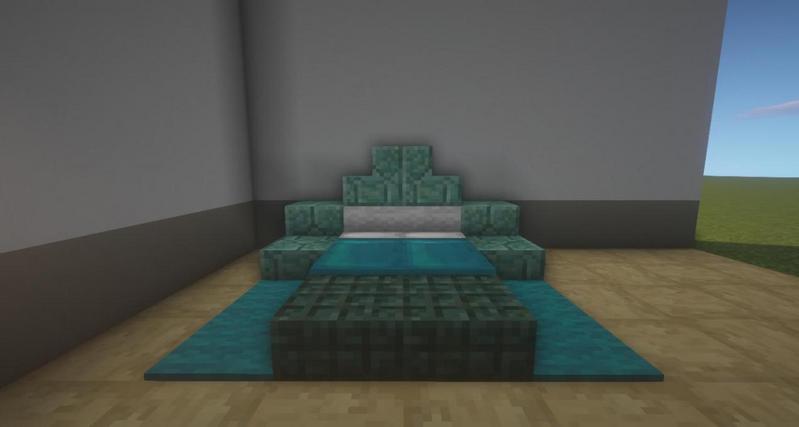 用海晶石砖楼梯和白色羊毛做出床头,放上青色床。