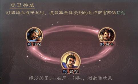 虎卫盾是由许褚、曹操、典韦三人组成,可获得【虎卫神威】缘分加成(对阵骑兵和枪兵时我军全体受到兵韧伤害降低12%)的体系。