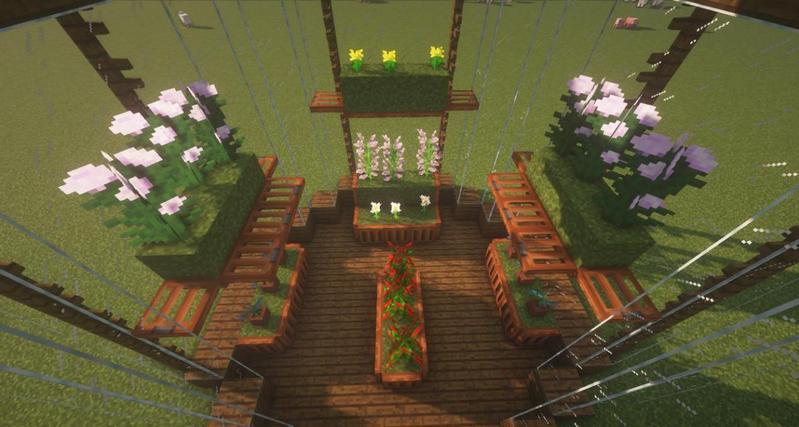内部装饰就很简单啦。用金合欢木活板门和草方块做花盆,在里面种上自己喜欢的花草就可以啦。
