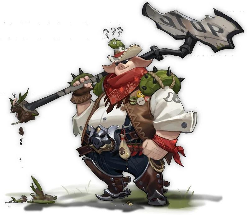 “大镖客三兄弟”里憨厚可爱的、贪吃爱财的猪八戒,身着西部牛仔装扮,搭配西部风格的装饰元素:铆钉,仙人掌,凸显大镖客形象。