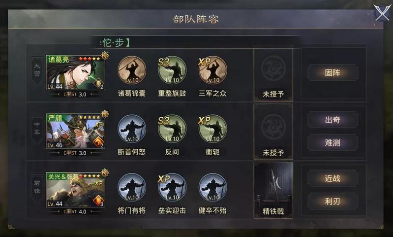 战法:XP垒实迎击+健卒不殆;近战+利刃