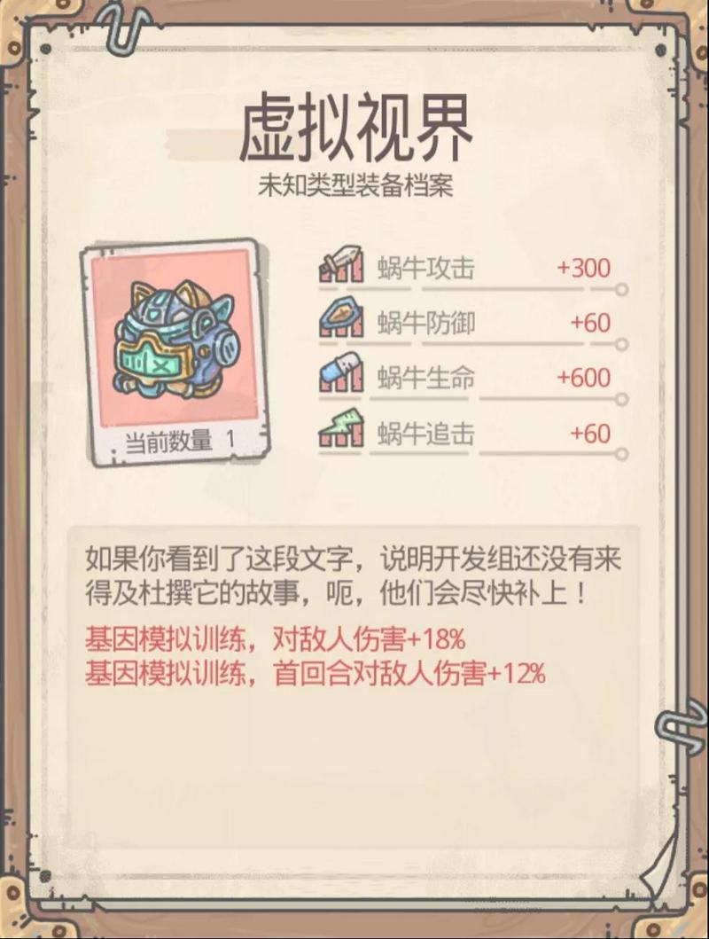虚拟视界的主要作用就是爬塔,在同阶段能比其他蜗牛获得更多资源,是资源型的装备,也没什么好介绍的。