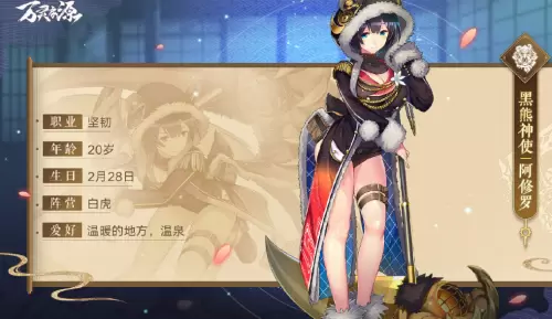 黑熊神使阿修罗平时悠哉悠哉的,一旦兴致上来就会很活跃!由于提着重型武器,动作稍迟缓但威力巨大。最喜欢的食物是核桃和鱼,喜欢小鱼干的都和琥珀一样优秀喵。