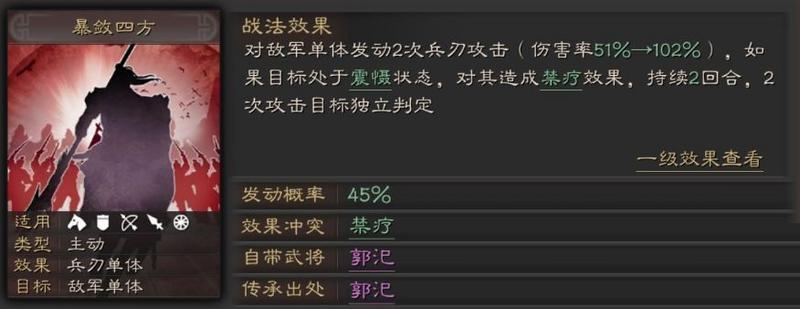 向敌军单体发动2次兵刃攻击(伤害率51%→102%),如果目标处于震慑状态,对其造成禁疗效果,持续2回合,2次攻击目标独立判定。