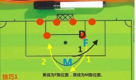 技巧1,利用队友进行绕桩交叉跑位,D如果长安自动盯防,会被我方M吸引走,F快速下顺到饼位点,要球吃饼。