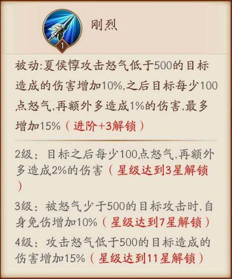 夏侯惇技能【刚烈】:被动,攻击怒气低于500的目标在成的伤害增加10%,之后目标每少100点怒气,再额外多造成1%的伤害,最多增加15%。