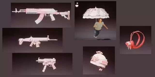首款甜蜜誓言M762特效皮肤以粉色系为主,升级后增加蝴蝶结装饰。背包设计尤为精巧,是目前游戏中最迷你的背包款式。同时,伞形飞行器也颇具特色。