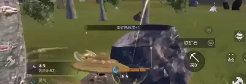 如果不是去矿山,那么在森林中也有零星散落的矿石,靠近石块就会出现采矿的图标,长按图标就可以进行挖矿的操作,这是比较基础的挖矿操作。挖矿多了可以提升挖矿等级,然后消耗技能点提升生活技能,就可以进一步提高挖矿效率。