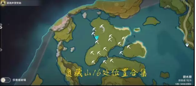 1、今天的宝藏位置在奥藏山,具体位置如下图标注,宝藏的位置一共有16处。