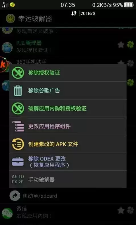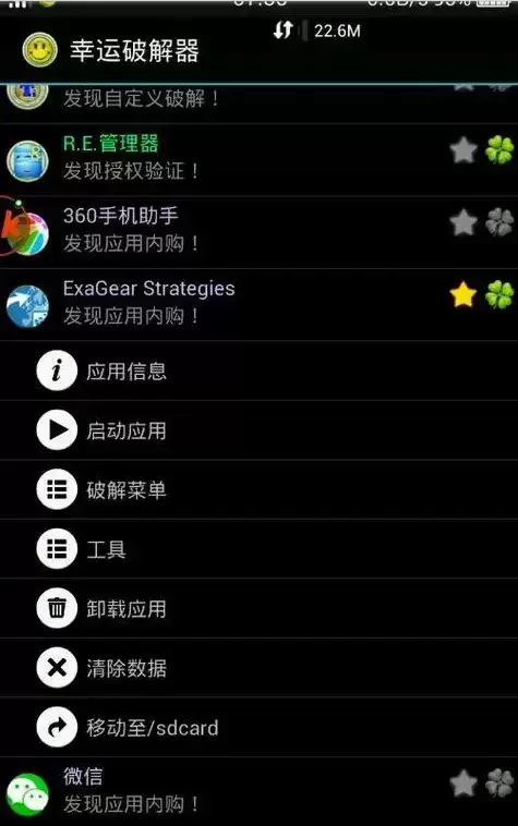 3、下载幸运破解器(注:幸运破解器一定要最新版不然没有移除内购功能)点击ExaGear选择破解菜单在选择第二项,如下图