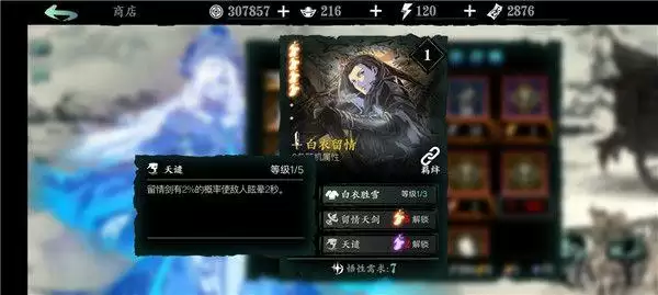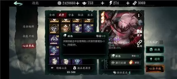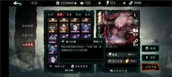 白衣留情:1绝技增加角色基础防御面板;2绝技辅助输出;3绝技概率眩晕,金色心法养成困难,不过可与黑暗无情搭配构成t1级别的黑白羁绊,前期神级羁绊