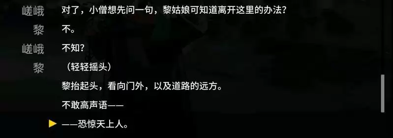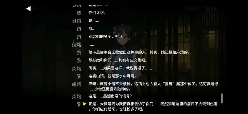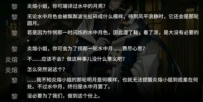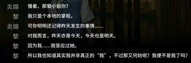 在WR-6中,黎回答了这个问题,她说是因为此前还有一个画外人(即夕)在此,故而不便作答。但为什么,在那人离开之后,黎还是不让炎熔说她的名字?为什么当黎说完“这婆山镇就是那水中月”之后,预示墨魉出没的钟立刻就响了呢?