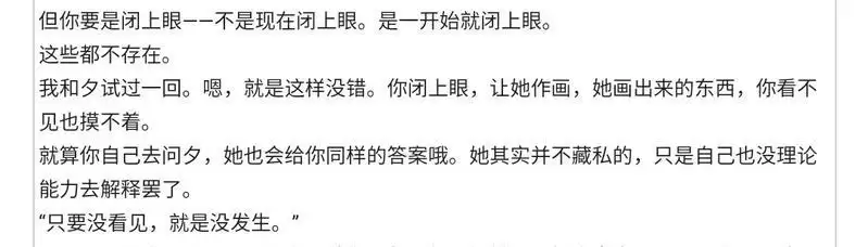 但黎却却并不担心这些,她担心的是夕会在这件事一直执迷不悟下去,忘掉一些原本理所当然的事情。最后反倒成了自己画中的画中人。
