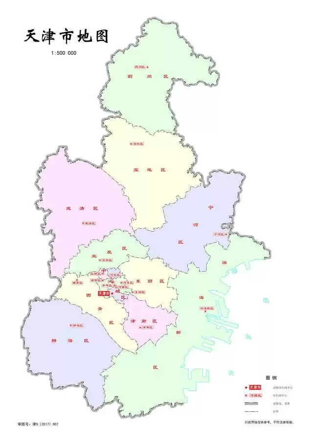 图二参考天津市规划和自然资源局官网的天津市行政区划图,除汉沽、塘沽和大港区合并为滨海新区外,蓟州区(蓟县)、宁河、宝坻、武清、静海均为县改区,行政区域变化不大