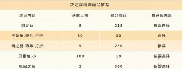 1、领地战积分根据大家领地战参与情况才会获取,所以有些玩家可能获取到的不是很多,但如果可以,玉龙角碎片是必换的,其他的要再做考虑。