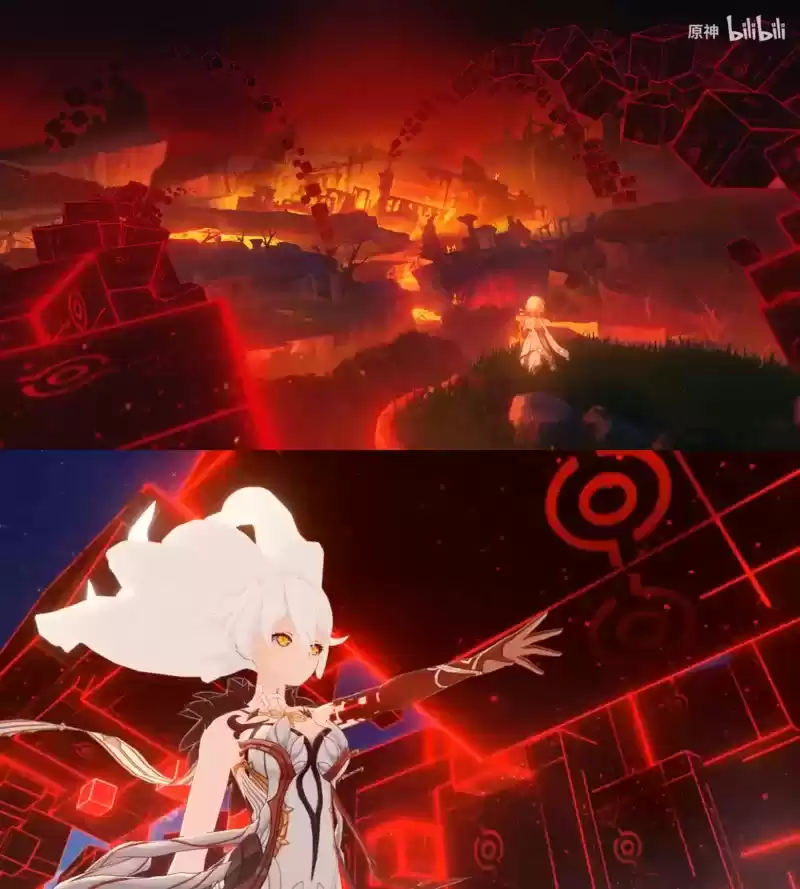 后一段则是目睹某个废墟的毁灭,从建筑风格上来看似乎是风龙废墟一带,而且画面中的红色方块与天理维系者的攻击方式一模一样,这也是天理毁灭论的起点。