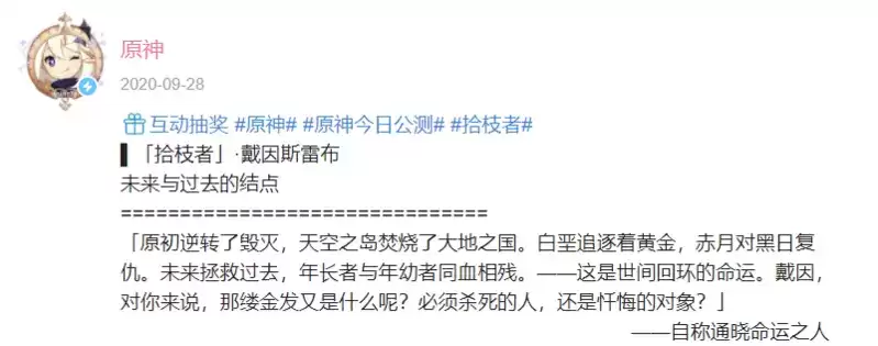 本次也是戴因斯雷布第一次出现在游戏中,这位原神最大的谜语人首次登场于主线预告PV《足迹》,之后又在名为拾枝杂谈的角色介绍系列视频里刷足了存在感。
