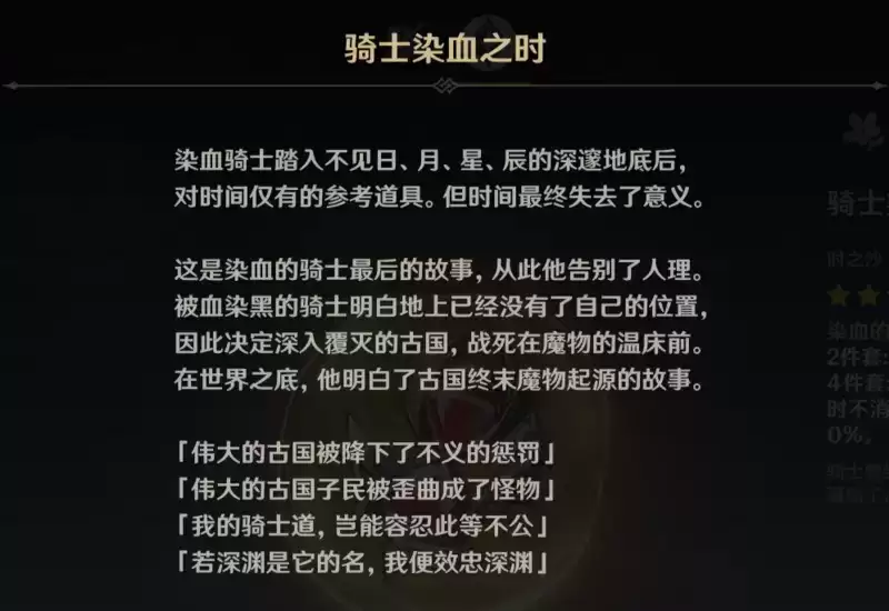 圣遗物骑士染血之时的背景故事中提到,某位骑士来到了覆灭的古国,认为古国被降下了不义的惩罚,子民被歪曲成怪物。而他宣誓效忠的对象,正是与天理相对的深渊。