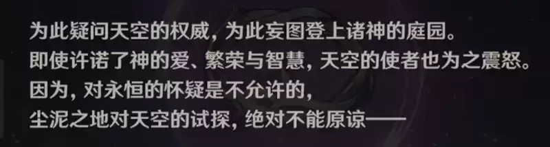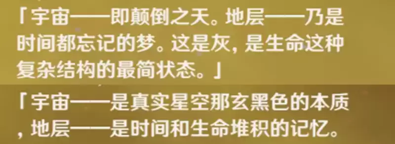 后半部分则要从阿贝多的资料中寻找答案。角色详情中提到“宇宙即是颠倒之天”,而角色故事3则描述了莱茵多特的教导“宇宙是真实星空玄黑色的本质”。