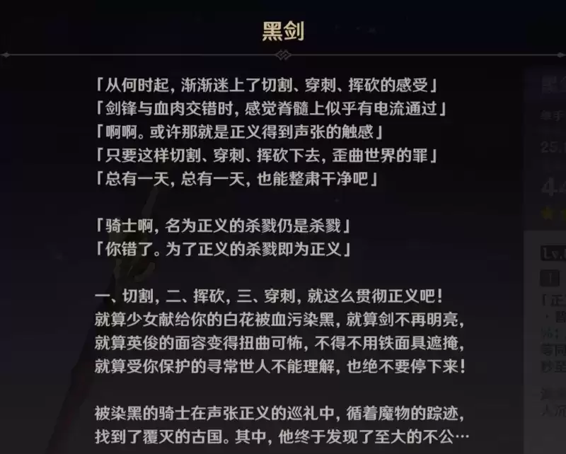 【Part 3 力量】荧妹的经历我们无从得知,所以也不知道她为何选择深渊,但染血骑士的故事已经有比较完整的记载。从黑剑的背景介绍来看,这位骑士已经完全沉醉于杀戮之中,正义观和骑士道都被扭曲成杀戮的借口。那么在这样的前提下,所谓不义的惩罚是否才是正义的天谴呢?