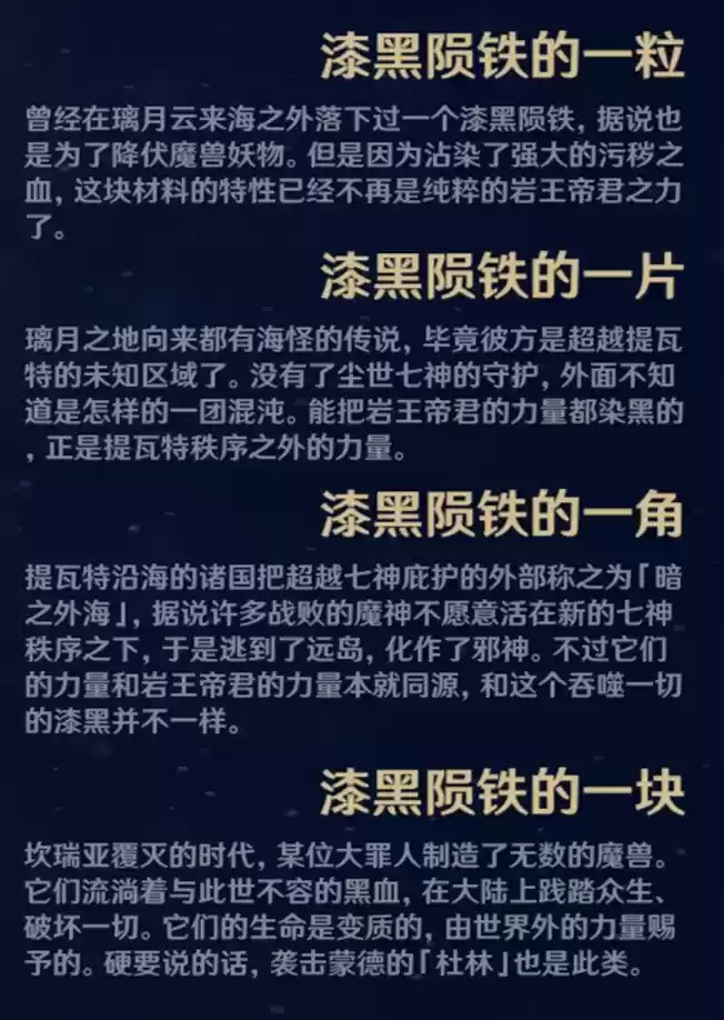 漆黑陨铁系列材料的描述中提到过暗之外海的存在,那是超越提瓦特秩序的混沌地区,有着汅秽而变质的力量,和深渊的描述高度吻合。
