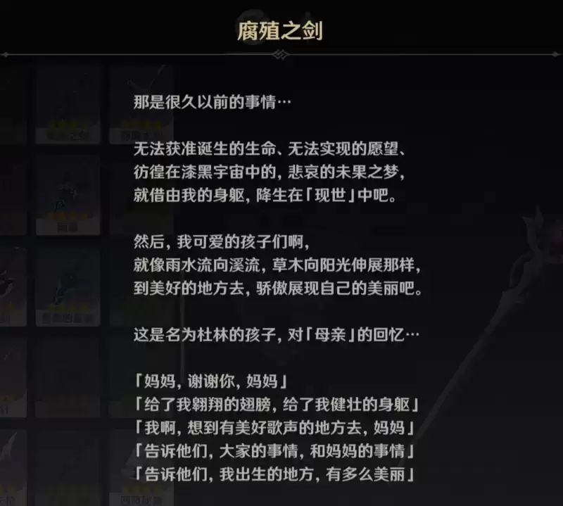 腐殖之剑和龙脊长枪都是以杜林为第一视角讲述的背景故事,其中提到杜林是无法获准诞生的生命、无法实现的愿望、悲哀的未果之梦,另外还提到了杜林诞生的源头:漆黑宇宙。