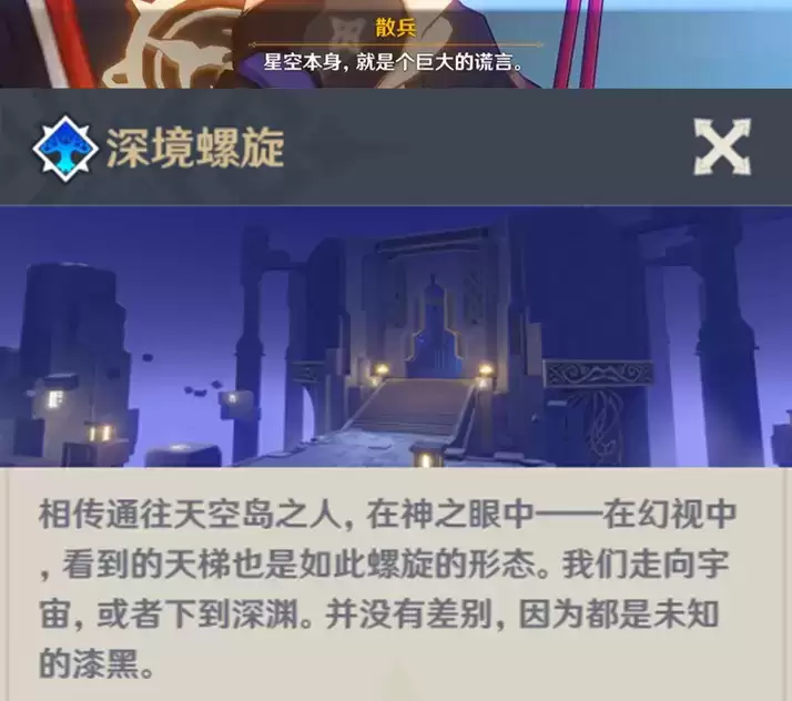 想必各位都还记得散兵在《未归的熄星》结尾所说的谜语“星空本身,就是个巨大的谎言”。再结合深境螺旋的描述:“宇宙和深渊都是未知的漆黑”,以及冒险家协会的口号“向着星辰与深渊”,或许说明深渊与星空之间存在着某种统一※。