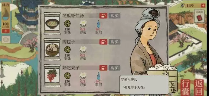 4、春菊道具可以兑换到一些物品,兑换肉包子、好吃果子、冬瓜汤这些。