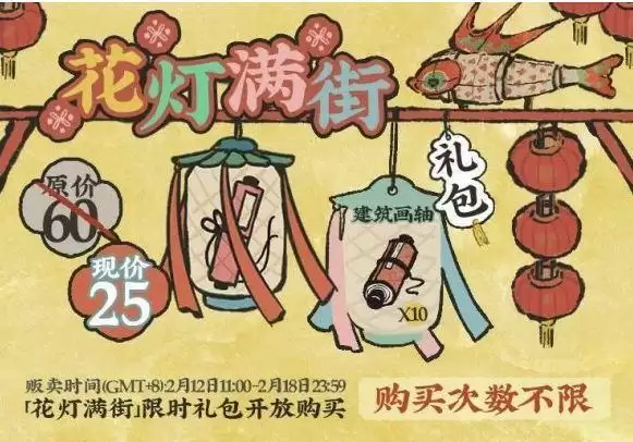 购买【花灯满街】礼包,即可获得:【建筑画轴】*10;礼包不限购。