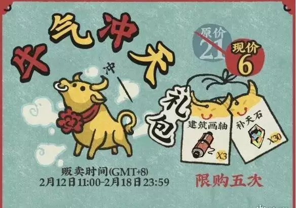 购买牛气冲天礼包,一次可以获得【建筑画轴】*3、【补天石】*30,可购买5次。