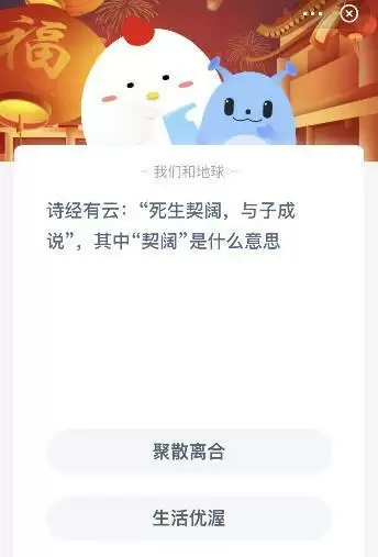 支付宝蚂蚁庄园小课堂2月18日每日一题答案是什么?支付宝蚂蚁庄园小课堂每天的凌晨更新一道题目,答对后能领取小鸡饲料,今天的问题是“诗经有云:“死生契阔,与子成说”,其中“契阔”是什么意思?”不知道答案的朋友不妨随三大妈小编一起来看看吧。