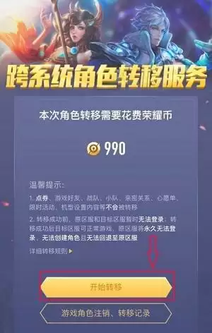 6、充值990荣耀币进行支付,角色处于离线状态即可从安卓转移至苹果。