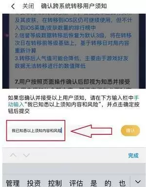 5、仔细阅读跨系统转移用户须知,在下方收动输入【我已知悉以上须知内容和风险】,点击确认;