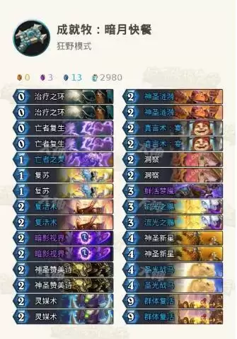 基本思路:虽然这看上去是刷子成就,但是事实上很好完成,可能你只需要一两把就能刷满90点进度了。卡组核心当然是[圣光战马],只带这个随从可以用[洞察]快速上手,然后就是各种奶牌和复活牌了,围绕圣光战马不断治疗刷生命值即可。要是遇到没有能直接解掉你大屁股圣光战马的卡组,真就直接一把刷完了。