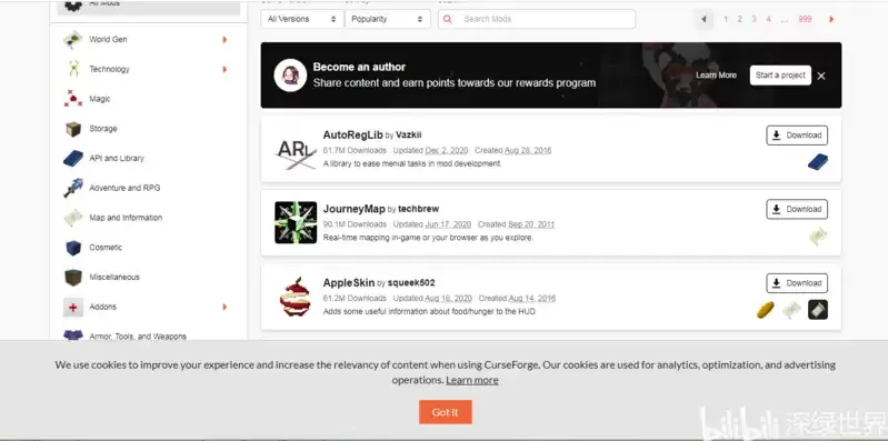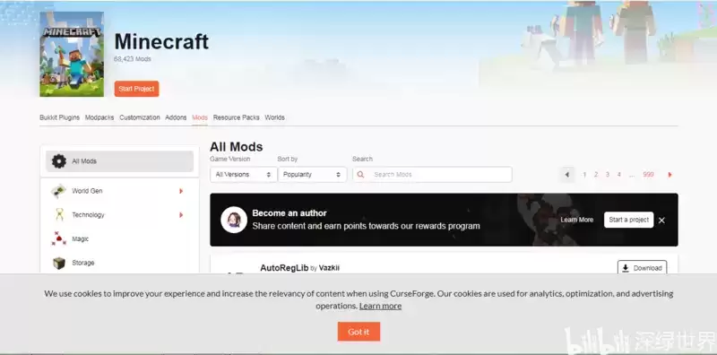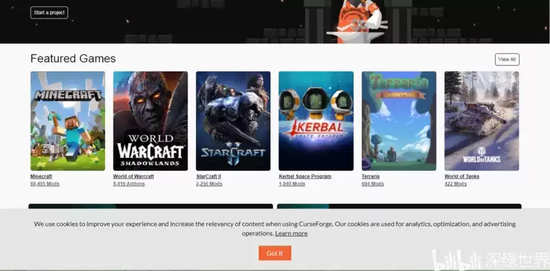Minecraft分版块的首页CurseForge的首页截图(你可以看到不少著名的单机游戏的版块,网址:https://www.curseforge.com):