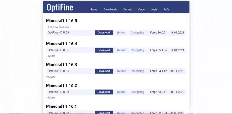 首页Optifine官方下载源(网址:https://optifine.net/downloads):