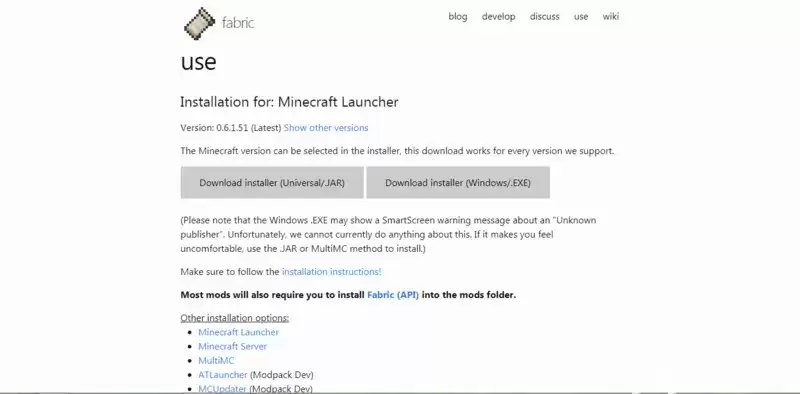 首页Fabric官方下载源(网址:https://fabricmc.net/use):