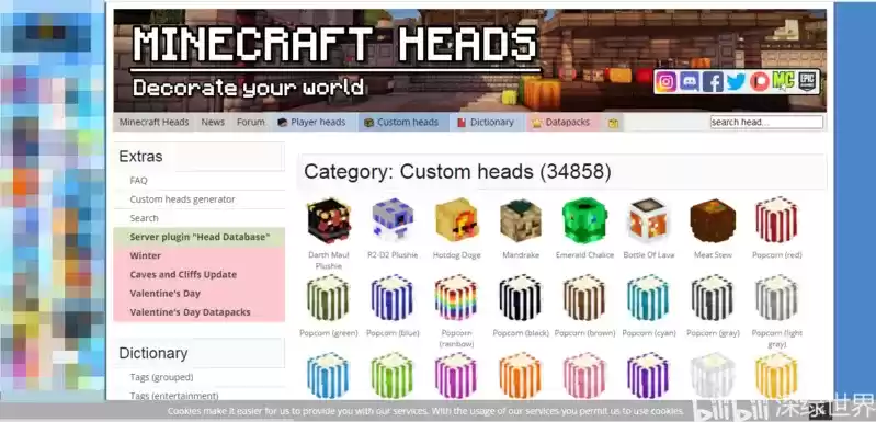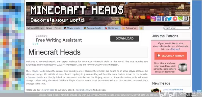 Minecraft Heads是一个有趣的网站。它收集了大量Minecraft装饰性头颅——这些有趣的小东西是利用Java版正版账户系统的头颅系统制作的(因此你如果想用这些东西必须拥有正版MC)。