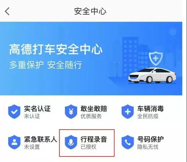 然后我打开了高德,也是很轻松就从个人页面里找到了安全页面,以及里面的行程录音说明。