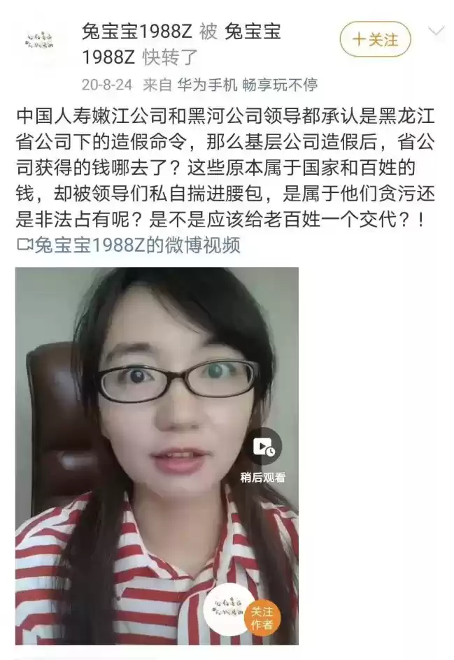 从2020年8月24日起,张乃丹还通过短视频的方式真人出镜继续举报中国人寿嫩江公司和黑河公司的造假贪污问题。