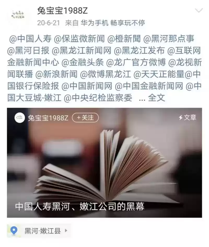 凤凰网财经《启阳路4号》发现,目前张乃丹微博发布内容中最早的一条是在2020年6月21日,其内容正是举报中国人寿黑河、嫩江公司黑幕的内容,当时还艾特了中国人寿、黑龙江新闻网、中国新闻网网、中央纪检监察委等官方微博,但似乎并未引起媒体和社会的太大关注。
