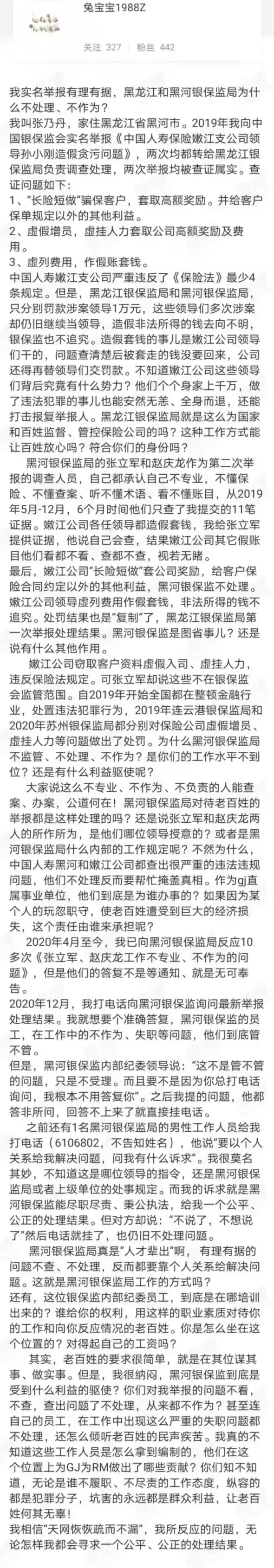 根据微博上的举报信内容,这名女员工名叫张乃丹,家住黑龙江省黑河市。2019年,张乃丹曾向中国银保监会实名举报《中国人寿保险嫩江支公司领导孙小刚造假贪污问题》。
