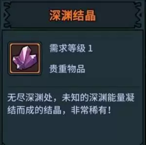1、深渊结晶暂无用途,他是由未知深渊能量凝结而来的,是一种比较稀有的结晶。