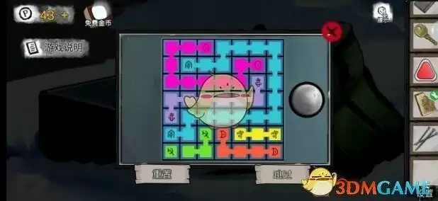 左边机关安上红色按钮解开(这个机关已经归位的按钮不会再动,所以要注意别把某些按钮留在滑道里滑不出来,前半部分比较难解,我做的一半放在这里做个参考↓→↑↑→↓←↑←↓←↓→,然后一定要优先把左上角的小锯子归位),拾取半把剪刀,捡到线索便签。