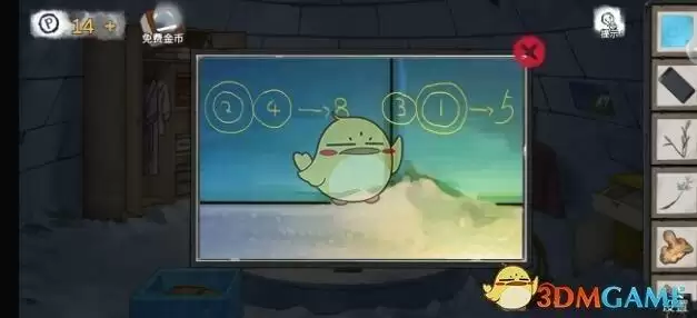 桌子上拾取蜡笔,打开桌子上的铁罐获得发卡,掀开床单拾取树杈,用树杈取下篮子,获得操纵杆和叉子,右边柜子的上层有盐,用叉子打开左边的砖获得方形滑块。用盐融化围墙外的冰雕拾取蓝色箭头,话说这个冰雕融化真的好渗人。在湖畔车里用发修好陷进去的开关,按下开关获得齿轮。蓝色箭头装在雪屋衣柜上。