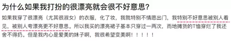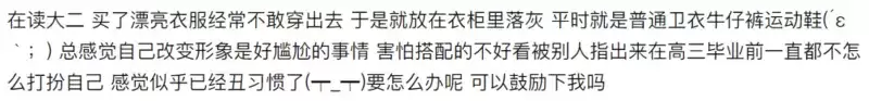 “总感觉自己改变形象是好尴尬的事情,害怕搭配得不好看被别人指出来,感觉似乎已经丑习惯了。”